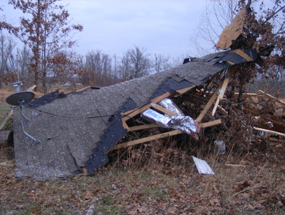 | The roof was blown into a nearby field. Looks like a dusting of snow on the ground, but that's probably insulation. |